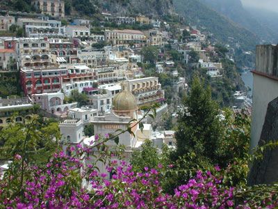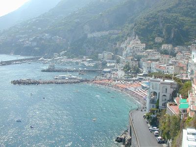 Domenica. On the Capitan Morgan mini-cruise to Positano and Amalfi. We had a most unique and wonderful dinner last night, but first I should bring this journal up to date. After writing in the patio with the cats, I grabbed my camera and retraced my steps to Il Postino beach, then ventured farther to the next one as well, to a cliff looking down upon a long thin brown sand beach curving to the west, with a view of