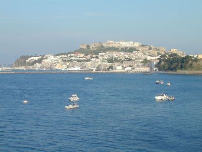Then later, M., B. & I went exploring and found the lighthouse near us at the foot of a long staircase, then the rocks at the base of the cliff in the late afternoon sun, with a picture-postcard view across the water to the port and the hill behind it – and beyond that to the mainland, with Vesuvius hazy in the distance.